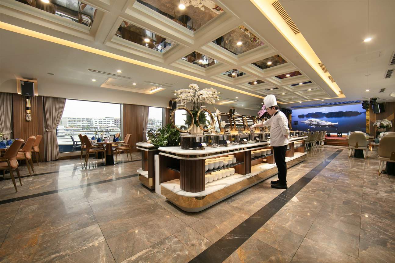 Deguste un menú gourmet cuidadosamente seleccionado, elaborado por talentosos expertos culinarios vietnamitas, en el elegante restaurante Bayview Dining. Los huéspedes podrán deleitarse con exquisitos platillos mientras disfrutan del ambiente al aire libre y admiran lugares emblemáticos como el pueblo pesquero de Hoa Cuong y el islote Finger, mientras el crucero navega por la impresionante bahía de Halong.